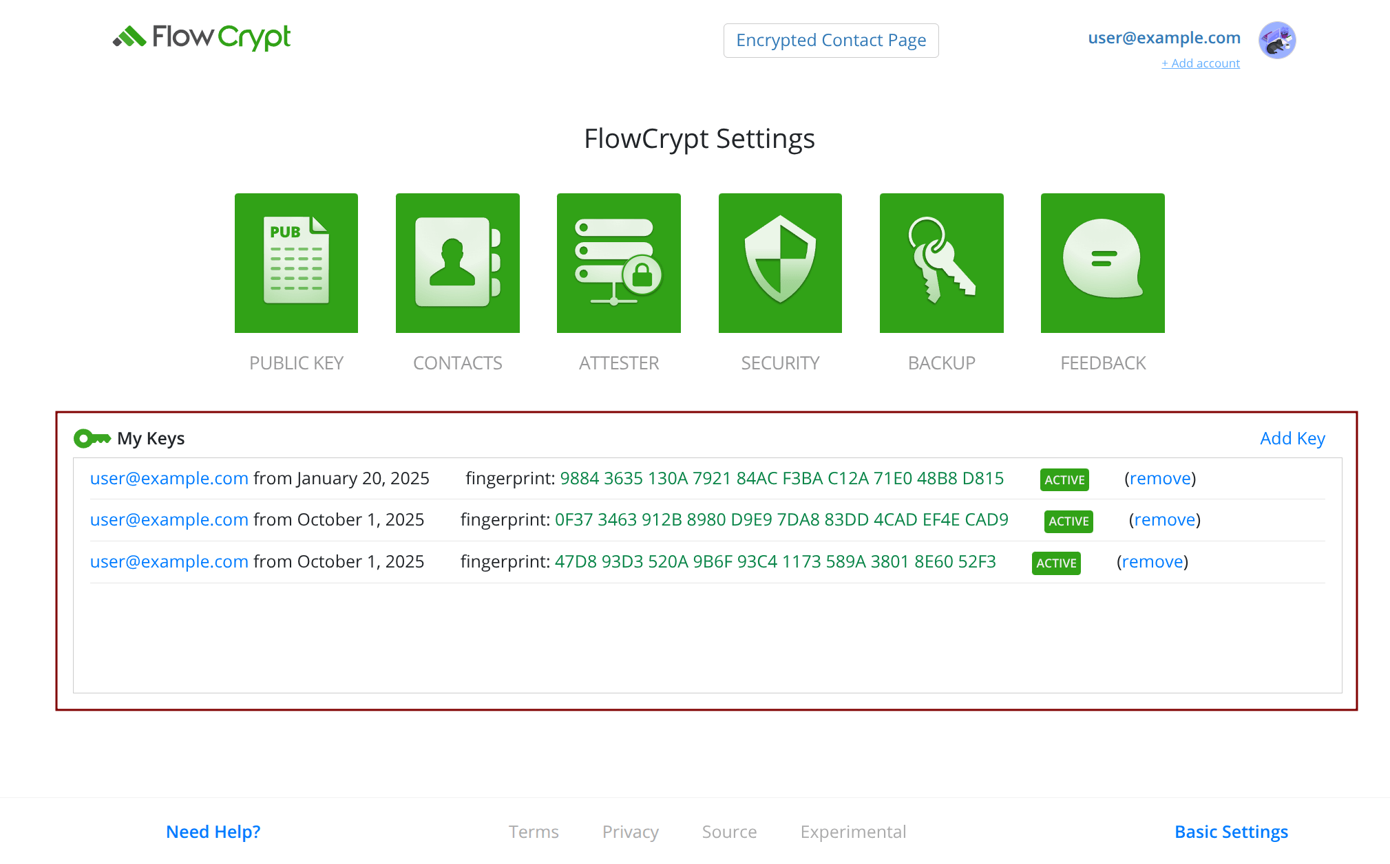 If you are using the FlowCrypt browser extension, go to the FlowCrypt Settings ⮕ Additional Settings, and check the My Keys section, where all the keys for that specific FlowCrypt installation are listed.